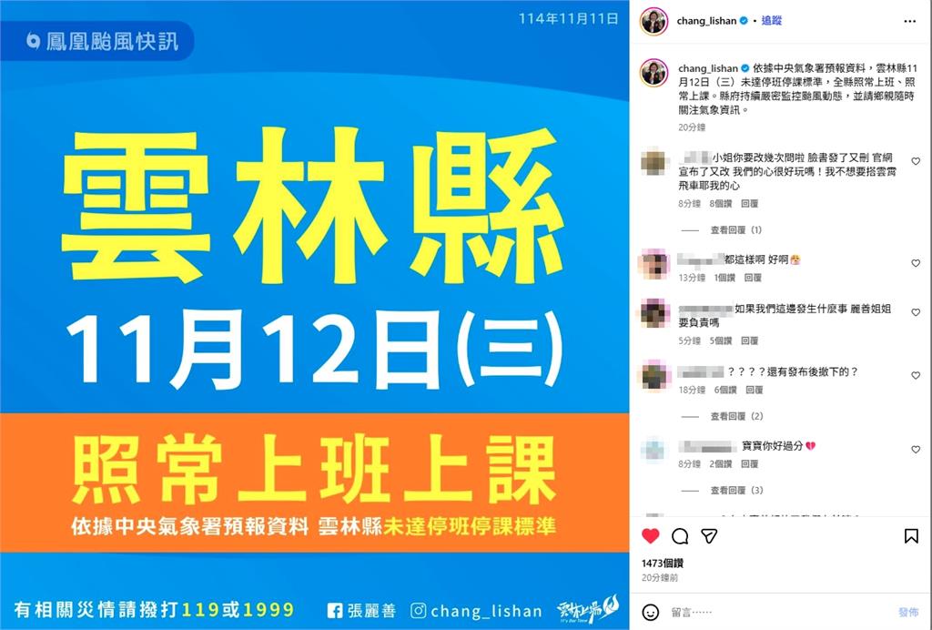 原本在人事行政局的網頁近八點時一度出現雲林縣停止上班上課,但隨後撤下,而張麗善的IG此時宣布「明日照常上班上課」,由於颱風期間民眾對停班課消息相當關注,此時紛紛湧入留言區抱怨,「還有發布後撤下的?」、「如果出事誰負責?」甚至有人氣憤表示,「小姐妳要改幾次?我們的心很好玩嗎?」形容心情宛如「搭雲霄飛車」。