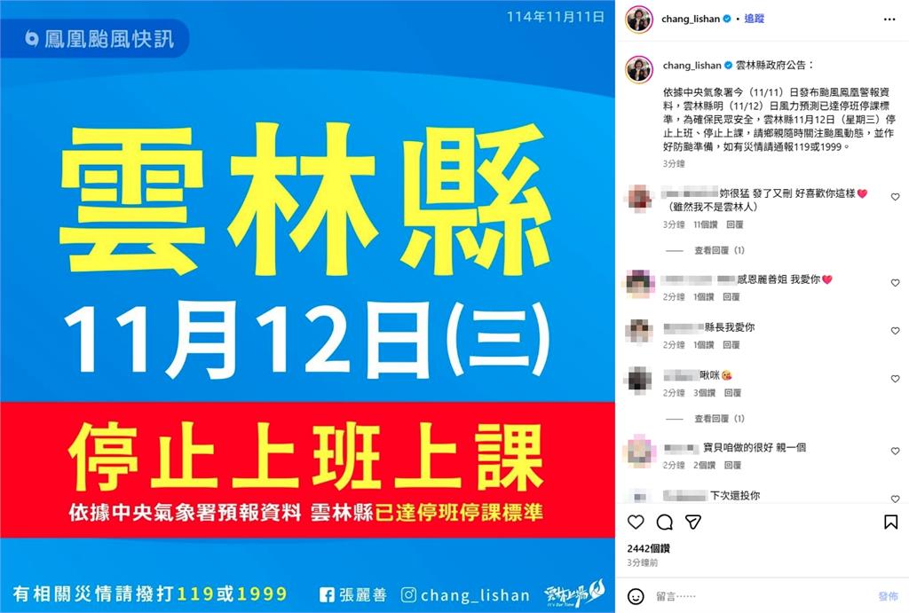 雲林縣正式宣布11/12停止上班課。圖/翻攝自張麗善IG責任編輯/蔡尚晉
