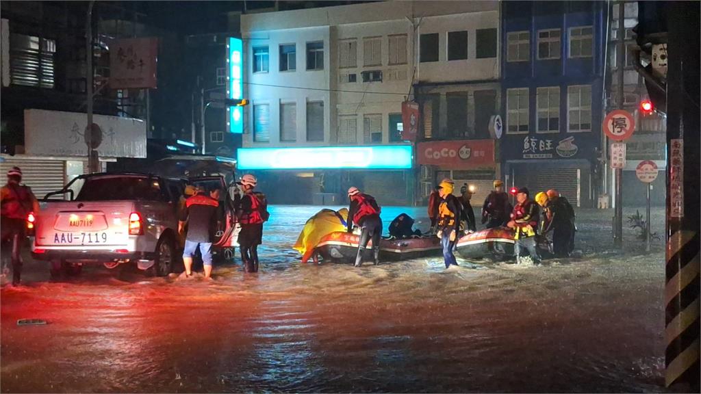 警消出動橡皮艇救援受困民眾。圖/翻攝自Facebook@蘇澳鎮公所鎮公所指出,入夜後雨勢未停,蘇澳鎮最熱鬧的中山路,最為人所知的蘇澳火車站前,水淹半層樓高,中油、全聯一帶低漥處,水淹最深一層樓高。軍方在暴雨之中,出動𝗔𝗔𝗩𝟳兩棲戰車、偕同消防救生艇深入積水處,在蘇北里長陳添琪指引下,一一帶出受困民眾,截至11日晚間23時,蘇澳鎮災防中心統計資料,已撤離199人、收容98人、依親4人、自行避難100人。