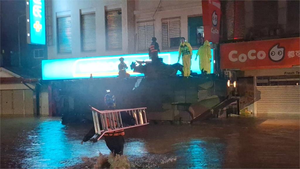 軍方出動𝗔𝗔𝗩𝟳兩棲戰車,偕同消防救生艇深入積水處救出受困民眾。圖/翻攝自Facebook@蘇澳鎮公所責任編輯/陳盈真