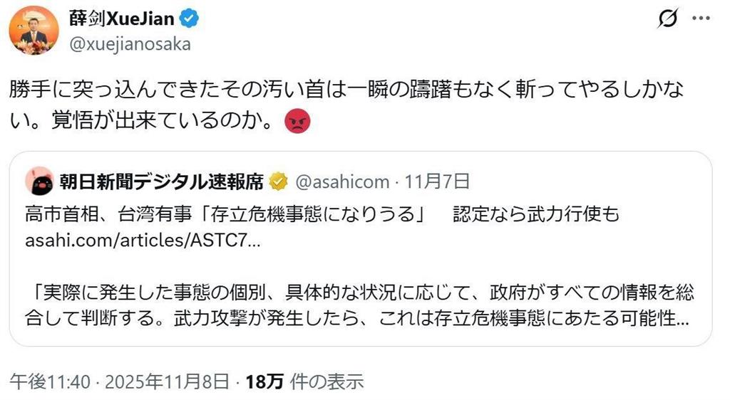 中國駐大阪總領事薛劍以「斬首」威脅回嗆高市早苗。圖/翻攝自X中共戰狼言論鬧得沸沸揚揚,美國總統川普日前接受福斯訪問也被問及此事,不過他沒有回應,而是重申自己跟中國關係友好,靠的是實力。路透社報導指出,日本官員討論存亡危機事態鮮少觸及實例,這回高市挑明說,似乎有打破「戰略模糊」立場的意圖。