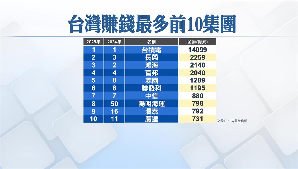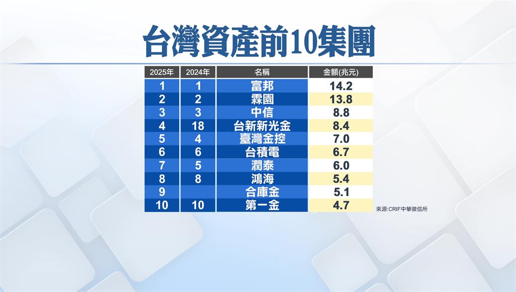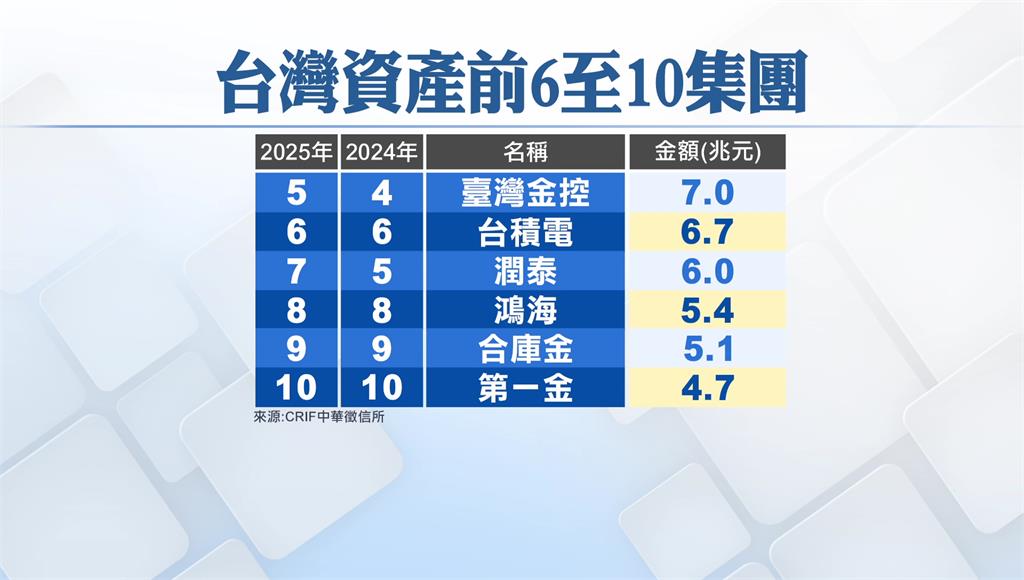 最新台灣資產前10大集團出爐!中華徵信所公布2025大型集團資產榜,前五名清一色都是金融業,而護國神山台積電資產高達6.7兆元排第六名,不過它是最會賺錢的企業,一年獲利超過1.4兆元,可說是名副其實的「賺錢王」。