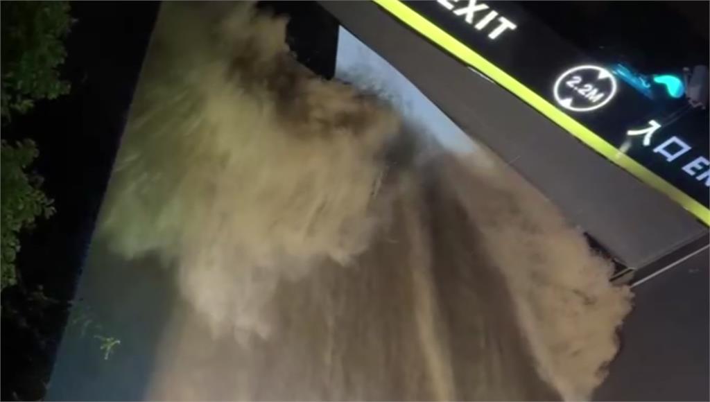 泥水淹進飯店地下停車場。圖/台視新聞眼看水勢越來越猛,飯店趕緊拉下鐵門,並在出入口堆沙包,但仍擋不住湍急水流,地下室B1水淹半個輪胎高、B2整層泡水淹沒,約50台車泡在水車。