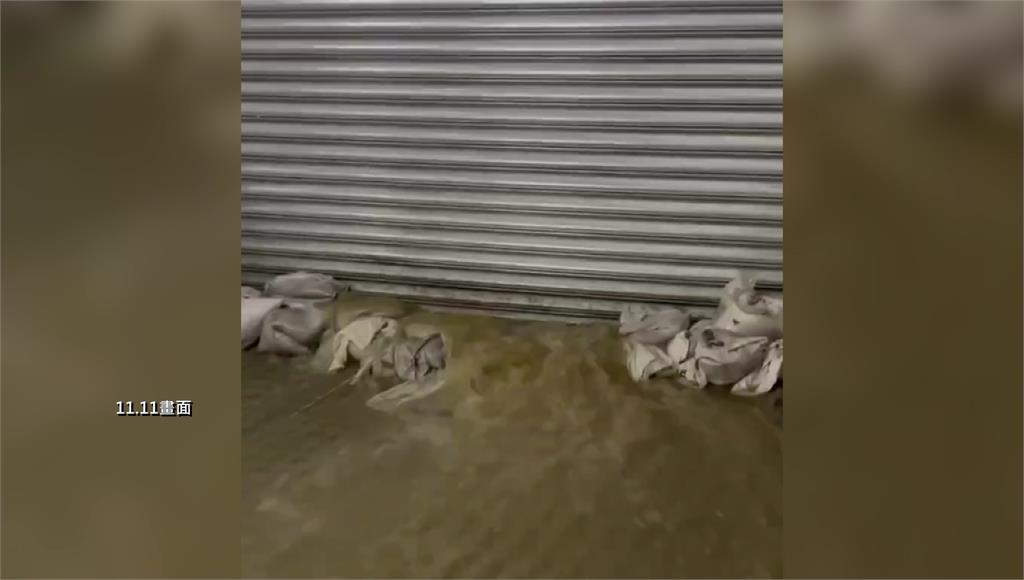 儘管拉下鐵門、堆沙包阻擋,仍擋不住猛烈水勢。圖/台視新聞