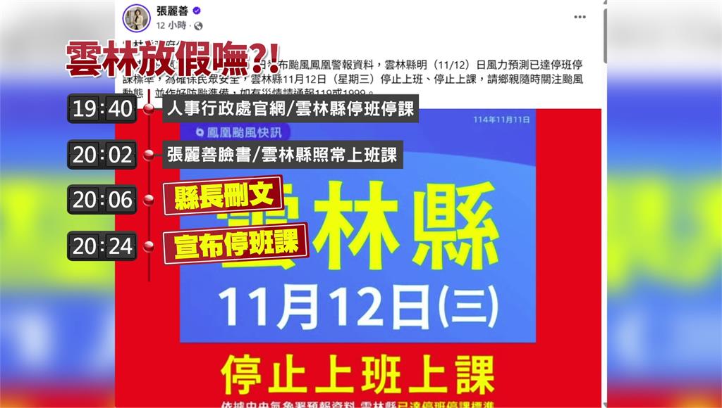 至於雲林則是像洗三溫暖一樣,11號晚上7:40,人事行政總處官網寫雲林放假,結果雲林縣長張麗善社群媒體卻說雲林照常上班課,到底有沒有放假?民眾疑惑時她卻刪文了,最後晚間8:24終於正式宣布停止上班上課。家長等學校通知,一下子正常上課,一下子不用上課,被搞得霧煞煞,不少民眾也灌爆留言,新聞處長事後致歉,表示是發布訊息時貼錯圖文。
