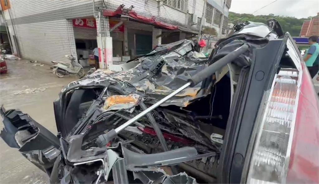 一台黑色轎車卡在路中央,左半邊被輾壓,車頂嚴重向下凹陷,擋風玻璃全部碎裂,從車尾看情況更是慘不忍睹。受到鳳凰颱風影響,宜蘭蘇澳鎮11號晚上被雨彈轟炸,中原路一度淹到1層樓高。