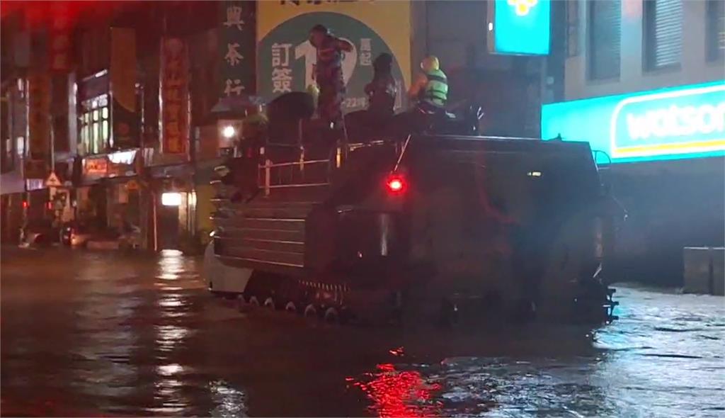 軍方昨晚出動AAV7裝甲車救災。圖/台視新聞軍方出動AAV7裝甲車協助救援,不料卻疑似因為視線不佳,直直輾過這輛轎車。眼看愛車變成一團廢鐵,天災加上人禍,車主無奈表示後續將求償問題,將與公所以及軍方協調。