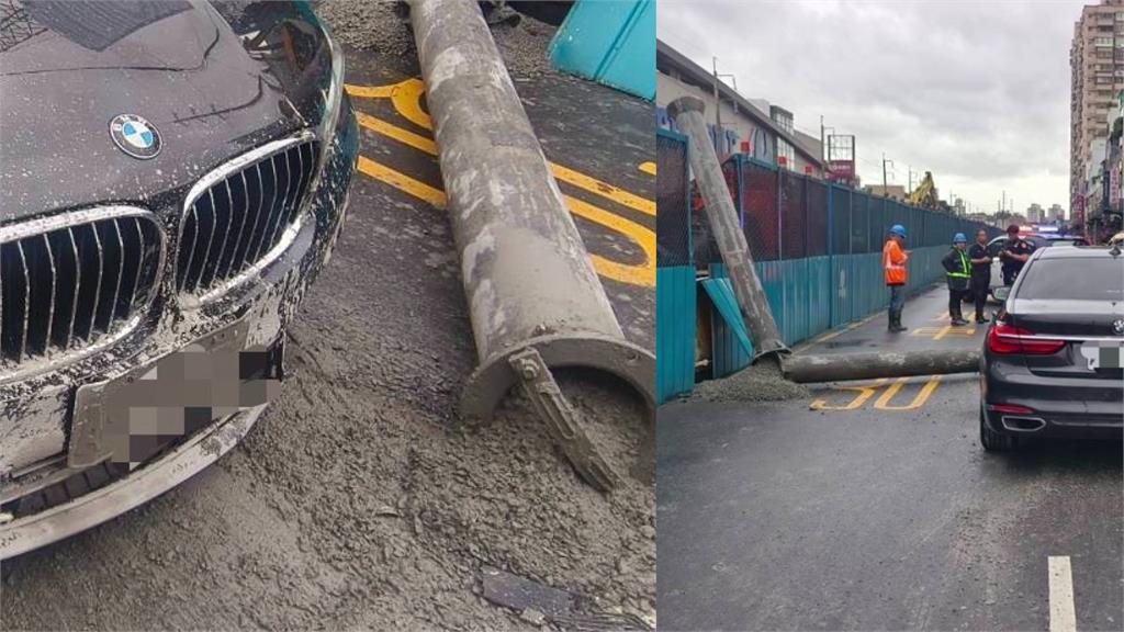 黑色BMW轎車的車頭被散落的水泥漿覆蓋。圖/台視新聞這根長長的鐵管,其實是稱為「特密管」的施工工具,用於連續壁工程的混凝土澆灌作業。