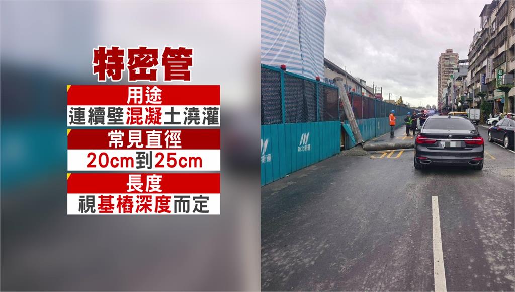 特密管用於連續壁工程的混凝土澆灌作業。圖/台視新聞製圖驚險影片一曝光,網友紛紛留言,「台灣工安的最新力作」、「車主真是好運」、「好人一生平安」、「現在經過施工區都要往上看一下」、「所有施工一律封路才最安全」。