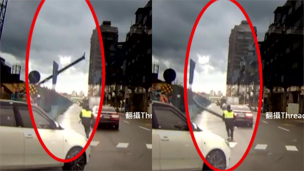 路上車來車往,施工單位竟未執行交通管制,吊車仍進行驚險的吊掛作業,只見一根長長的鐵管懸空搖晃,從車道晃到加油站一側,又回到工地,沒想到就在此時,這根至少兩層樓高的鐵管竟意外脫鉤,撞上圍籬,全程目擊的義交奮力衝出去,試圖擋住左轉而來的BMW轎車,但為時已晚,驚險場景幾乎像電影《絕命終結站》在眼前上演。