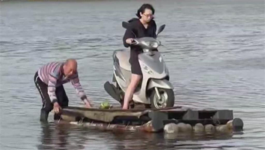 宜蘭縣五結鄉成興路受到豪雨影響,嚴重淹水,12日一早積水雖尚未退去,放眼望去一片汪洋上驚見一名女子雙手緊握龍頭、橫跨在機車上,而下方竟是一艘大型竹筏,一旁還有男子站在水中協助牽引。