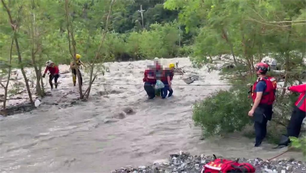 消防隊員全副武裝協助白米溪上游居民脫困。圖/台視新聞宜蘭/張愷廷、陳可親、郭致汎 責任編輯/蔡尚晉