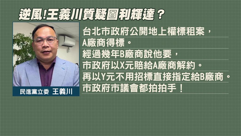 民進黨北市議員才力挺輝達在北市落腳,沒想到綠營如今爆出雜音!綠委王義川社群發文,表示北市府地上權標租由A廠商得標,B廠商說他要,市府解約,不用招標就指定給B,市府議會卻拍拍手,可以這麼隨興嗎?質疑有沒有圖利問題?這字字句句暗指輝達總部案!