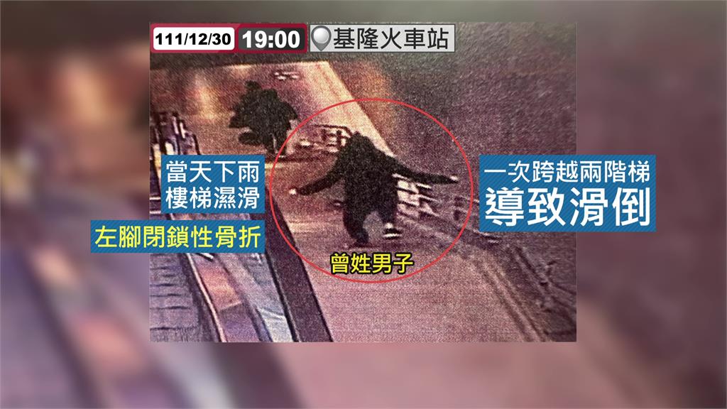 曾姓男子到基隆火車站搭車往台北,在月台間下樓時連跨兩階樓梯,卻因下雨天地板濕滑,不小心向前滑倒受傷,當場痛到無法站立行走,緊急叫救護車送醫,醫師診斷為左腳脛骨與腓骨下端閉鎖性骨折。男子指控台鐵,現場沒有任何防滑保護或提醒措施,下雨天地面潮濕,也沒有設置警告標語,因此提出國賠162萬。