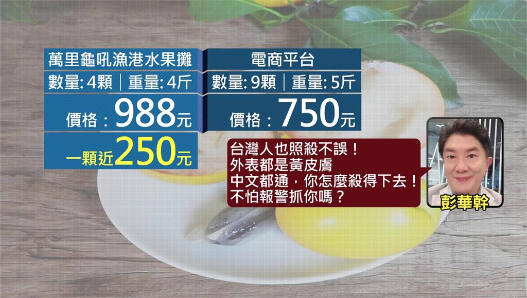 金黃圓滿的黃金果備受民眾喜愛,然而萬里龜吼漁港卻傳出攤商坑殺觀光客!資深媒體人彭華幹透露,朋友日前帶美國來的僑胞去龜吼漁港,在水果攤買了4顆共4斤的黃金果,要價988元、平均一顆250元。後來上網查發現電商平台一箱9顆5斤只要750元。他氣憤批評攤販連台灣人也照坑殺不誤,「外表都是黃皮膚、中文都通,你怎麼殺得下去!不怕報警抓你嗎?」