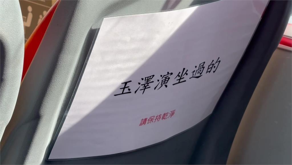 公車司機在椅子貼告示「玉澤演坐過的」。圖/台視新聞玉澤演為了拍攝新作品來到台中,還獨自趴趴走,去了台中公園、綠園道、百貨公司,都留下他的身影,照片不僅展現台灣感性,還有濃濃台味。