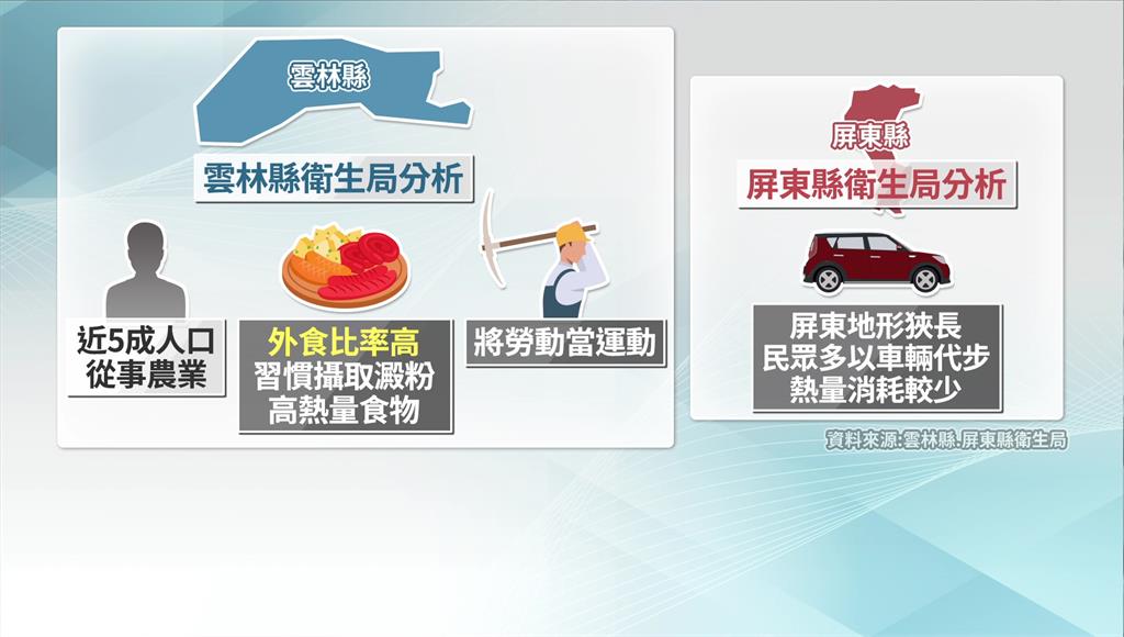全台BMI過高或肥胖人口比率排名前五縣市。圖/台視新聞為何雲林的肥胖人口會高居全台第一呢?衛生局分析,由於當地近5成人口從事農業,外食比率高,習慣攝取澱粉或高熱量食物,又把勞動當成運動;至於第二名的屏東縣,則可能因地形狹長,民眾多以車輛代步,因此熱量消耗較少導致。