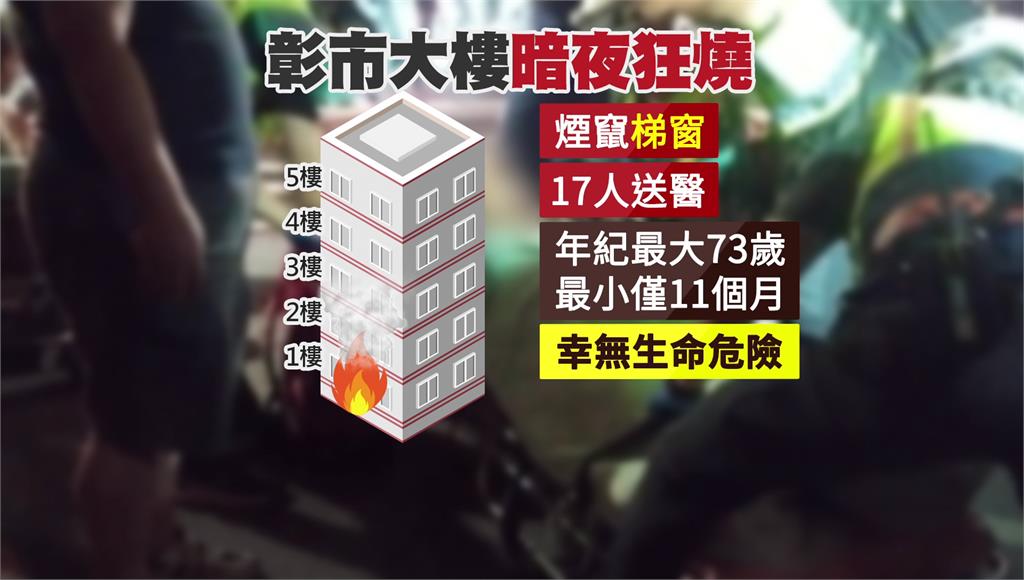 警消從樓中救出17人,最小僅11個月大。圖/台視新聞事發在16號凌晨,彰化市中華西路143巷內的一棟老舊集合式住宅,停放在1樓的機車不明原因起火,雖然火勢在屋外,但濃煙隨著樓梯和窗戶竄進,多位住戶被嗆傷,消防入內搜救,分別於不同樓層救出共17人,年紀最大73歲,最小只有11個月,送醫後都沒有生命危險。