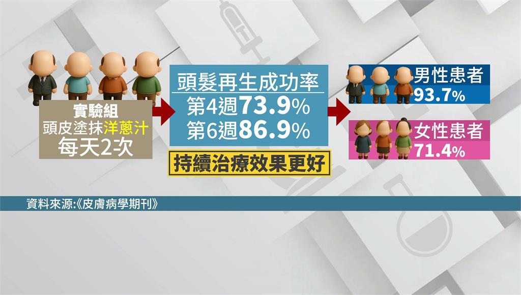 其中,男性患者成功率達93.7%;女性則是71.4%,研究人員推測,不同性別的頭皮,具有生理上或荷爾蒙環境的差異,且洋蔥品質跟處理過程的差異,會影響治療效果,也不排除會引發過敏反應,提醒想試試看天然療法的民眾,必須考慮相關風險。