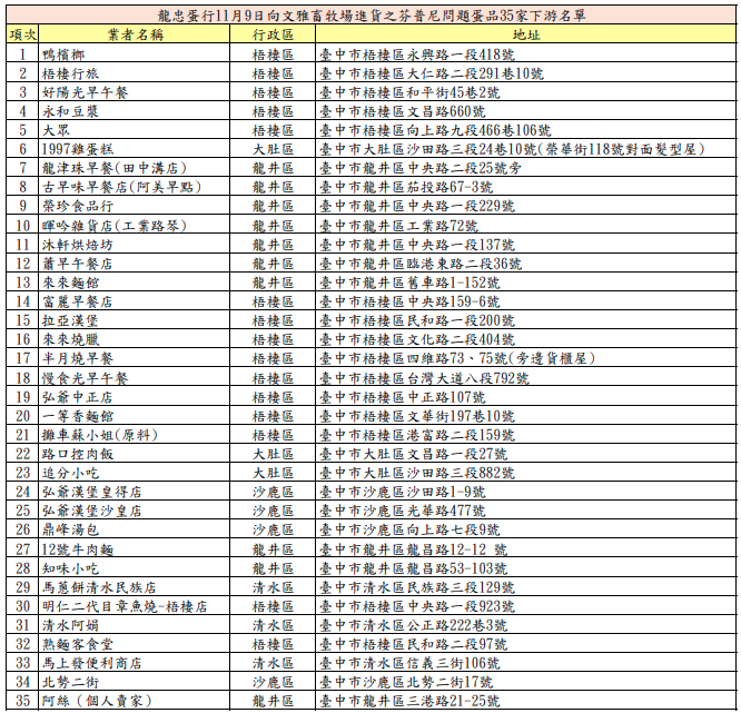 龍忠蛋行35家下游完整名單曝光。圖/翻攝自台中市政府官網責任編輯/蔡尚晉