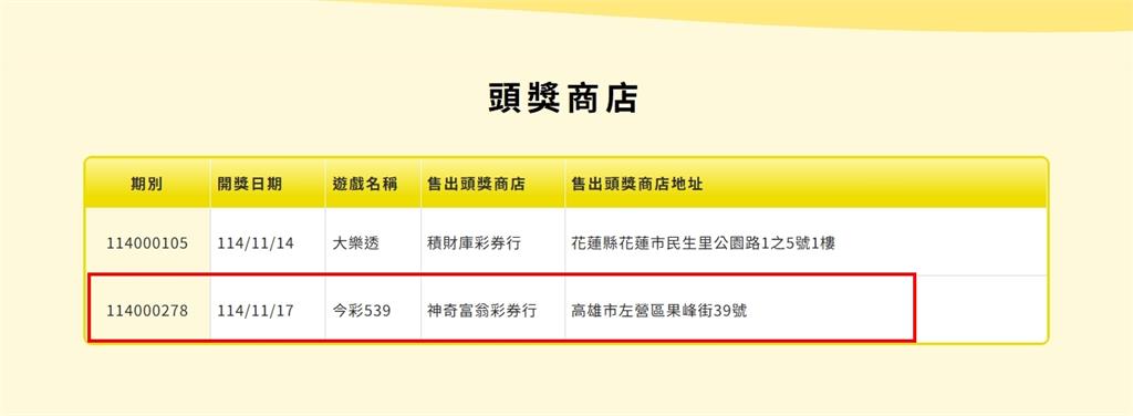 開出頭獎彩券行。圖/翻攝自台彩官網11/17獎項獎號如下:
