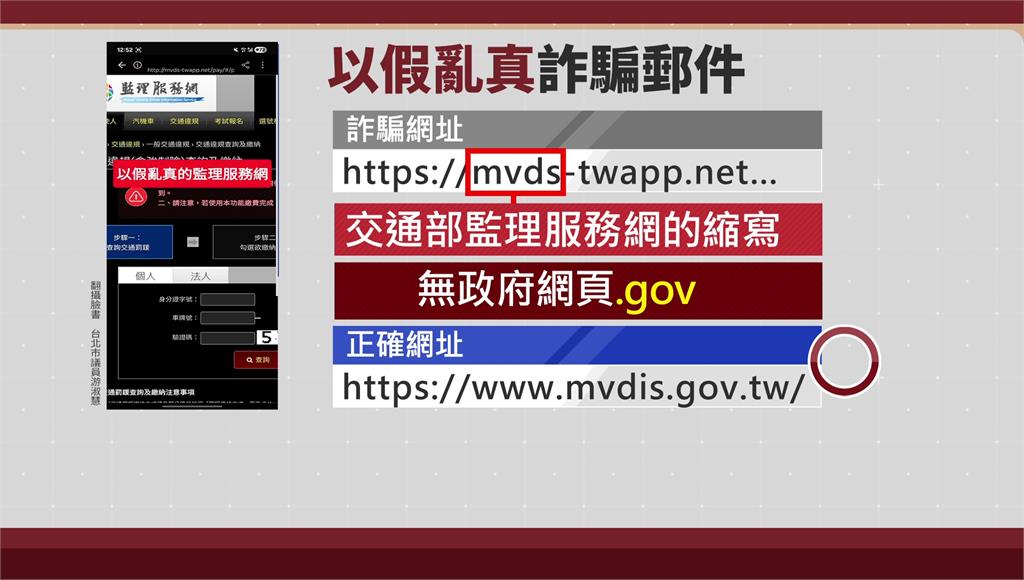 游淑慧打開詐騙網頁後發現,與真正的交通部監理服務網有九成相似,比對兩者網頁後,她注意到詐騙網頁中的「mvds」確實是監理服務網的縮寫,但網址最後卻沒有政府網頁的「.gov」。游淑慧指出,除了網址不對以外,該網頁的其他功能通通無法點擊,唯獨登錄個資的功能可以操作。