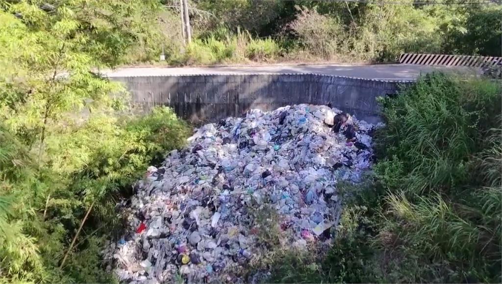 從空拍畫面來看,山坡上堆滿垃圾幾乎看不到原本的坡地,蒼蠅成群、惡臭撲鼻,依堆疊高度判斷,這些垃圾約有數十噸,數量驚人。