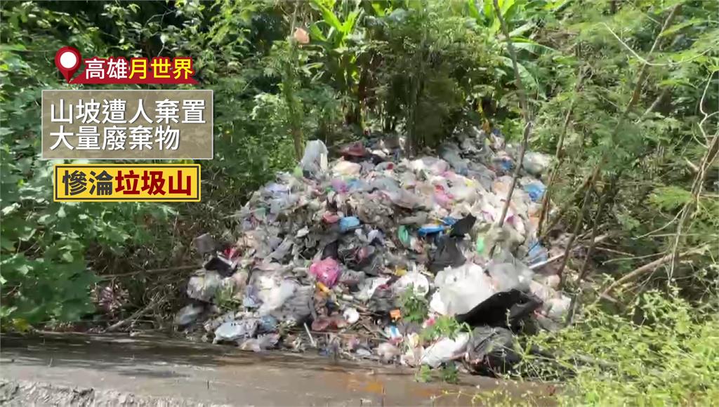 山坡上遭不肖業者惡意傾倒垃圾。圖/台視新聞垃圾出現地點就在高雄知名景點月世界,原本的景觀慘被破壞,環保局獲報後,立即調派13部清運車輛到場清理。