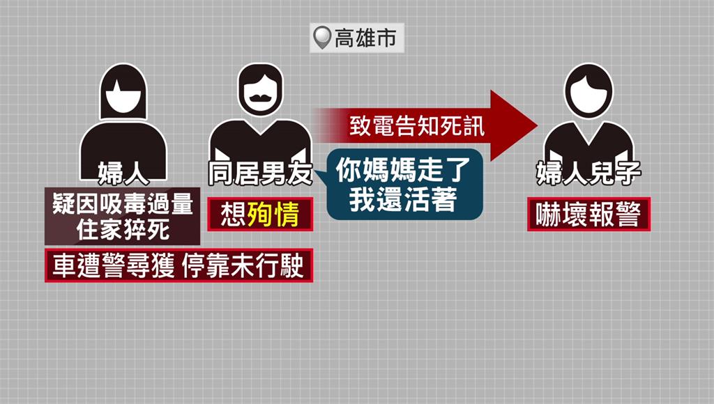 高雄一名婦人疑似因吸毒過量在住處猝死,同居男友竟致電婦人兒子,告知「你的媽媽走了」,並透露有殉情念頭,之後便開車載走婦人遺體去向不明,嚇得婦人兒子立即報警。警方攔截到車輛時,發現婦人遺體仍在車上,目前已報請相驗,釐清其真正死因。