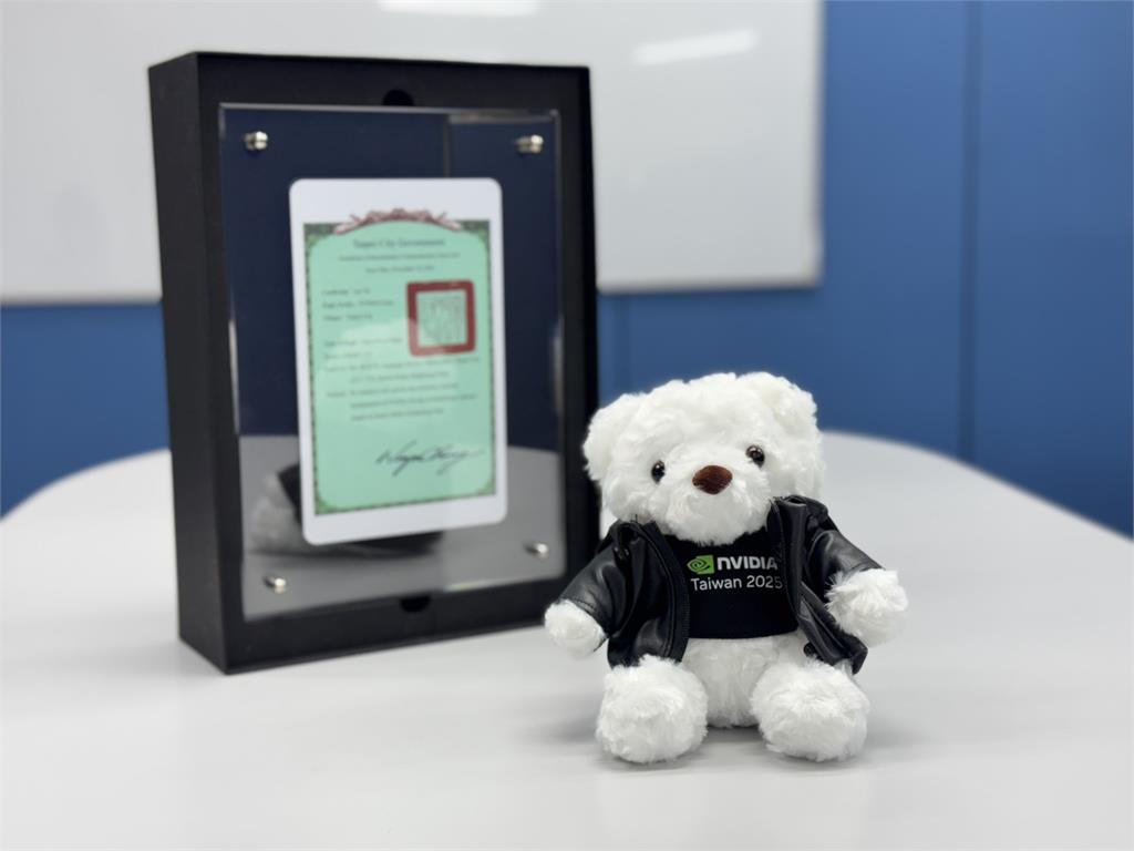 會面尾聲,蔣市長向Ekman副總裁一行人致贈特製的「T17、T18土地權狀造型悠遊卡」,Ekman副總裁則回贈輝達吉祥物皮衣白熊玩偶。