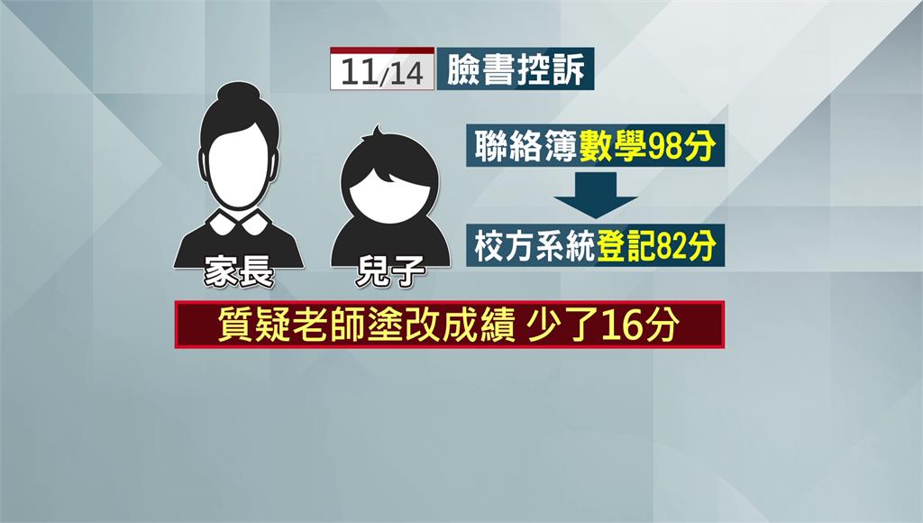 家長14號在臉書控訴,稱兒子聯絡簿自己寫數學考98分,但校方系統卻登記82分,質疑老師塗改成績,足足少了16分,而想親自查看考卷,考卷卻不見了。