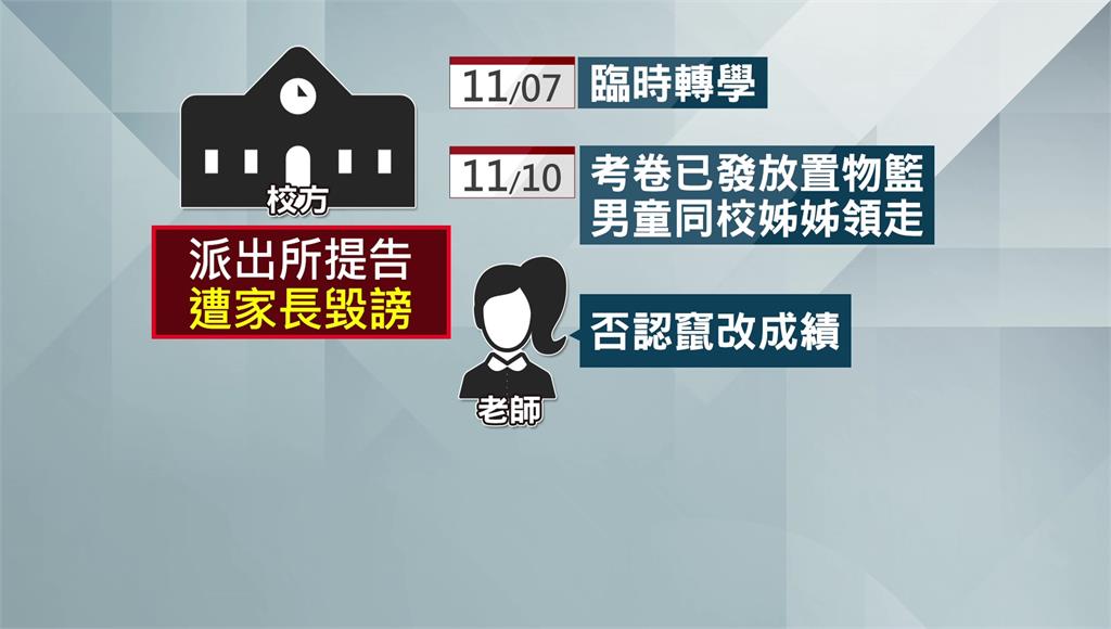 家長質疑老師塗改成績。圖/台視新聞校長表示本月7日,該名男童臨時轉學,10號時考卷已發放置物籃,由男童同校姊姊領走,老師也否認竄改成績。校方15號晚間也去派出所提告遭家長毀謗。