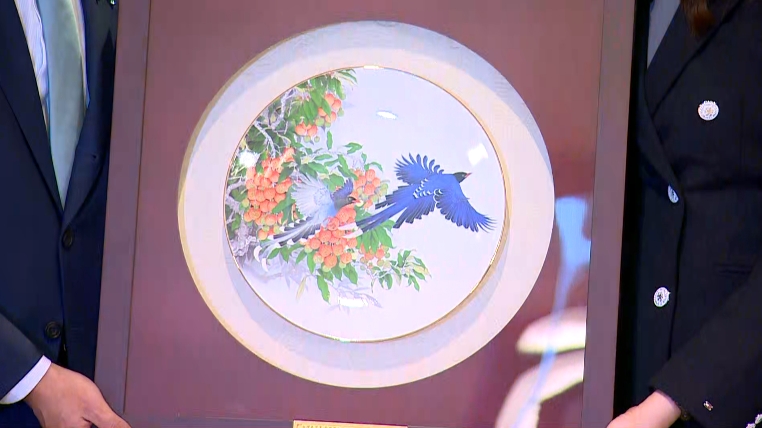 鄭麗文今天身穿灰色洋裝與排扣西裝外套亮相,特別挑選來自新北鶯歌的彩瓷圓盤致贈黃主席,藍色、白色鵲鳥共同高飛,象徵「雙鵲同行、藍白必贏」。主持人也介紹說,圓盤也代表藍白合作,必定在溝通下順利圓滿。