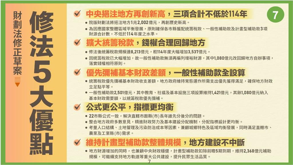 財政部指出院版財劃法的5大特點。圖/財政部提供本次財劃法修正案,在垂直分配部分,規劃擴大中央統籌稅款規模,並合理調整一般性補助款規模,使得地方財源增加同時,亦兼顧中央財政穩健,有能力提供更多計畫型補助款額度;水平分配部分,規劃各縣市按同一公式分配,優先滿足地方政府基本財政收支差額及搭配財源保障機制,使修法後各地方政府獲配之統籌稅款與一般性補助款合計數不低於114年度的獲配及補助水準。並精進財政努力及基本建設需求分配指標,兼顧城鄉特色及區域均衡,預期修法後整體縣市淨增財源及平均增幅均將高於直轄市。