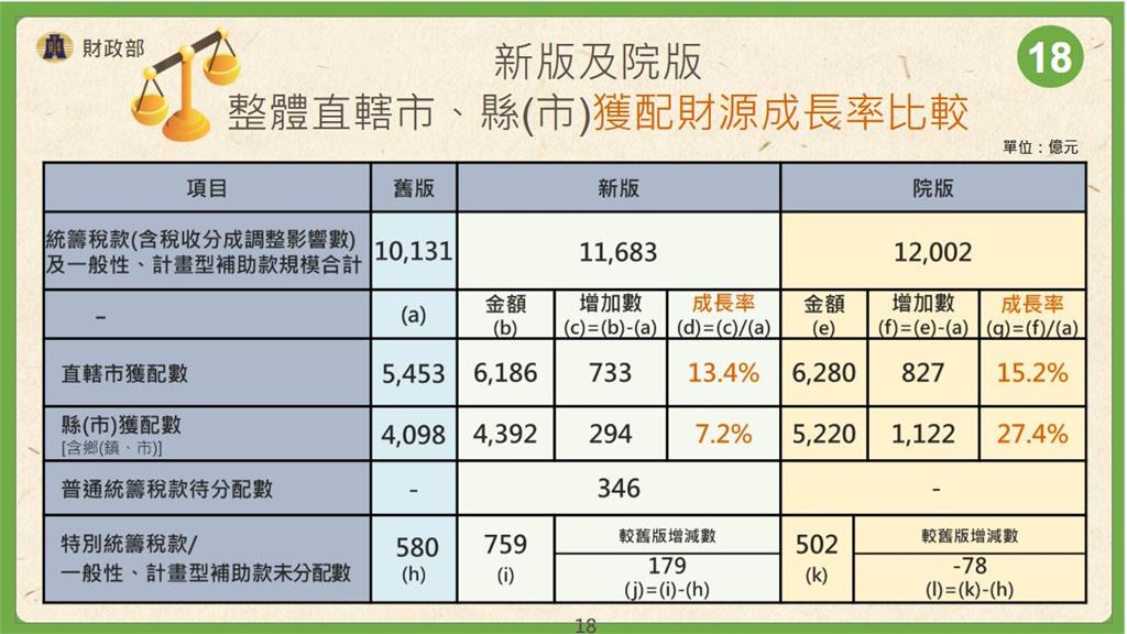 行政院今(20)日通過財劃法部分條文修正草案,中央對地方的補助,包含統籌分配稅款、一般性補助、計畫型補助3項合計除不低於今年,加總規模拉高到1兆2002億,比立法院三讀版本的1兆1683億還要多。另外22市縣公式一致,解決直轄市跟縣市長年以來誰先分後分的問題。