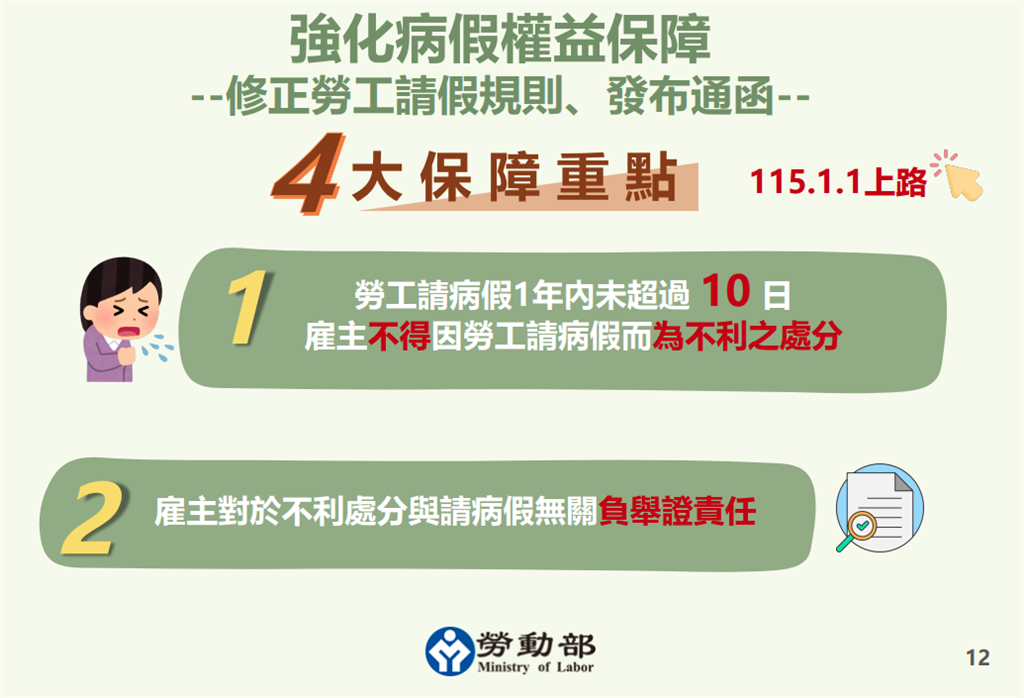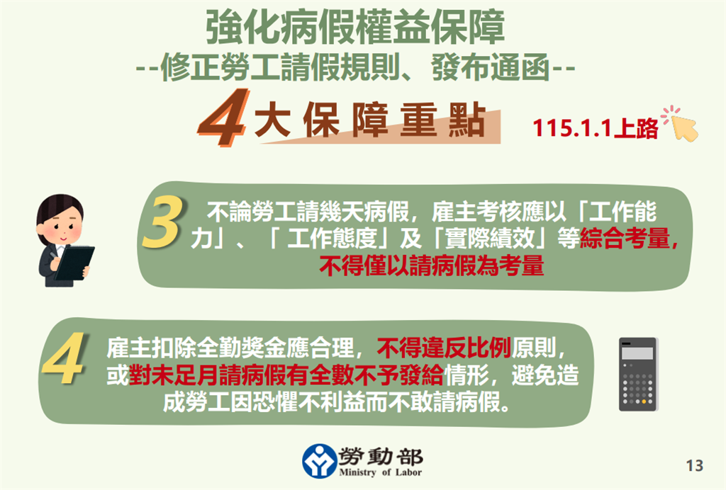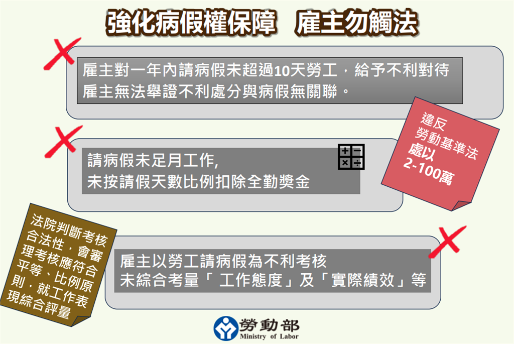 勞動部推「四大病假保障」。圖/勞動部提供此外,勞動部也將持續函請民航局調查組員突發疾病處置機制是否落實,啟動職場不法侵害調查程序,並對違反勞基法部分移請桃園市政府裁處。同時,對僱主提醒三點,違反修法規定可處2至100萬元罰鍰,扣全勤獎金須符合比例原則,考核不得濫用管理權。