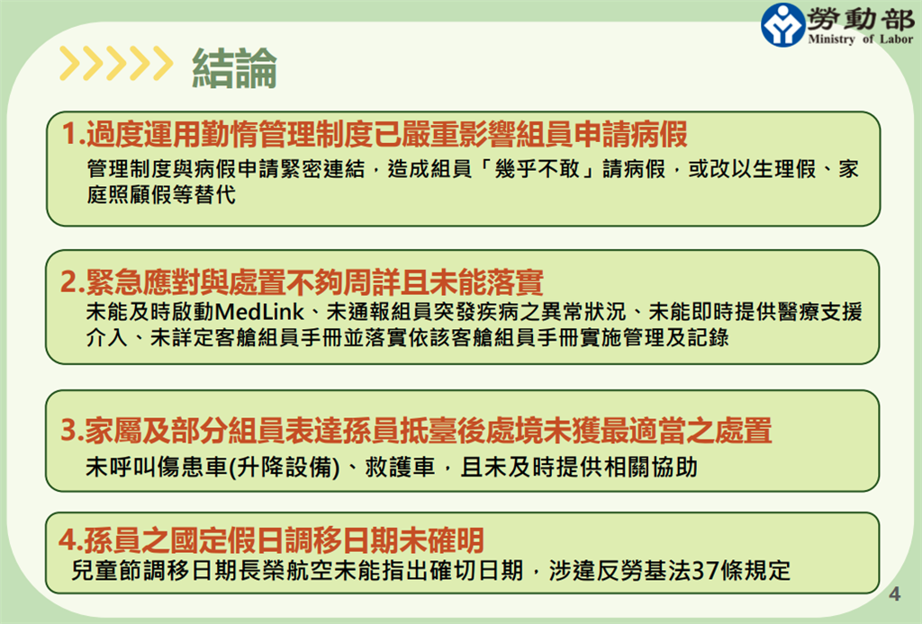 經調查,勞動部得出四大結論:第一,長榮航空過度運用勤惰管理制度,嚴重影響組員申請病假意願。公司將病假與排班、休假申請、調班排序及績效評分緊密連動,三個月內病假超過三天就喪失相關申請權,且請病假會影響年終獎金與升遷,導致組員多以生理假或家庭照顧假替代,甚至抱病上班。