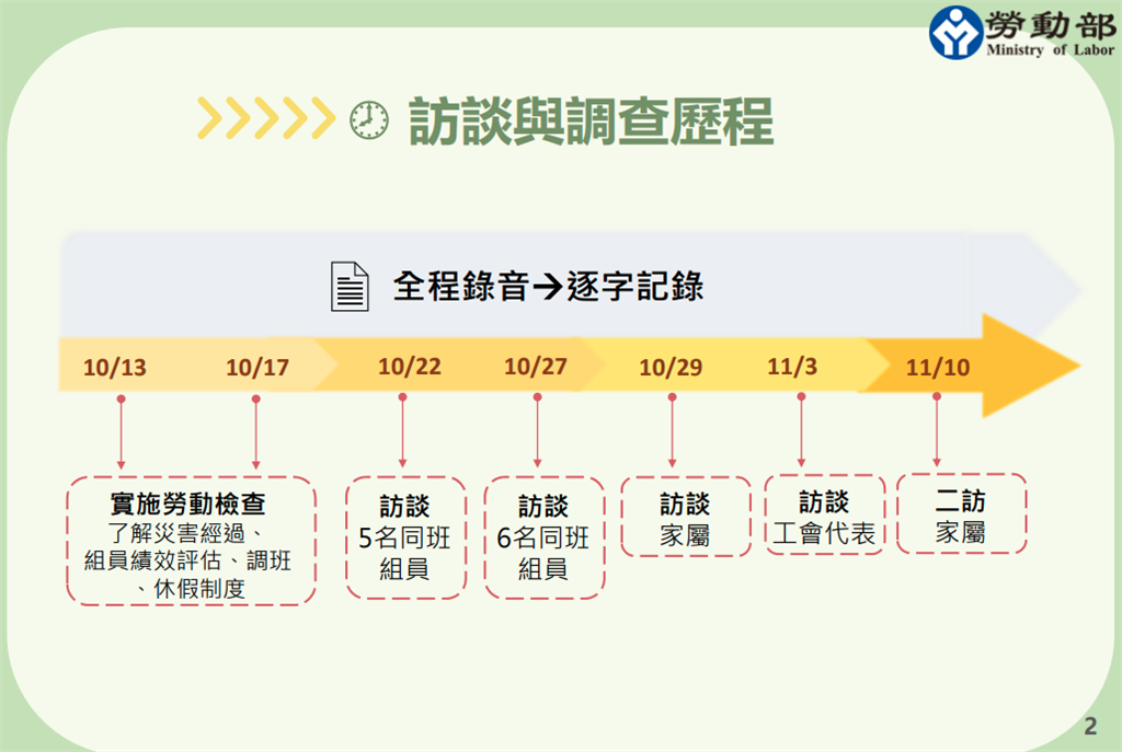 勞動部職業安全衛生署林毓堂署長指出,調查期間共完成七次訪談與勞檢,包含11名客艙組員、孫員家屬、工會及公司,並全程採隔離訪談、錄音與逐字記錄。