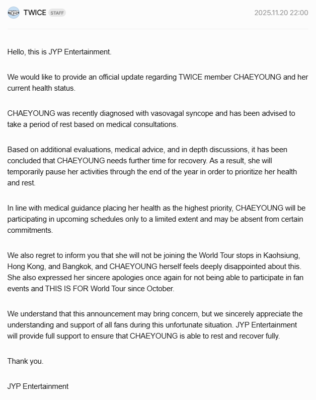 聲明中表示,彩瑛將無法參與高雄、香港與曼谷的巡演場次,彩瑛本人對此也感到非常失望。公司理解這項公告可能會讓大家對彩瑛狀況感到擔心,但仍誠摯感謝所有粉絲在這段期間的理解與支持。JYP將全力支持彩瑛,確保她能充分休息並完全恢復健康。