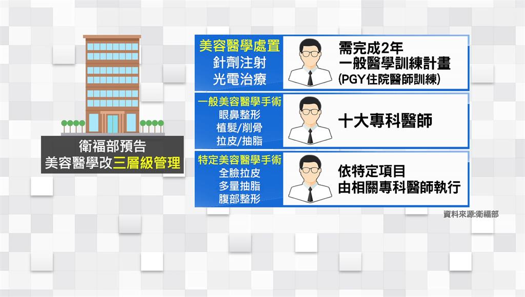 衛福部指出,近年醫美糾紛頻傳,得改善管理缺口,預告將美容醫學改為三層級管理,執行醫師也要有相對應資格,第一級的美容醫學處置,像是針劑注射、光電治療等,醫師需完成2年一般醫學訓練計畫,也就是PGY住院醫師訓練。