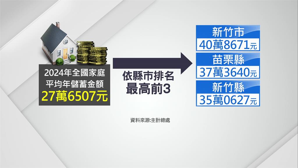 台灣人在全球相對愛儲蓄。根據主計總處統計,去年全國家庭平均年儲蓄金額來到27萬6507元,再創新高,從各縣市來看,新竹市以40.8萬高居第一,成為全台儲蓄王;第二名是苗栗縣,第三名則是新竹縣。