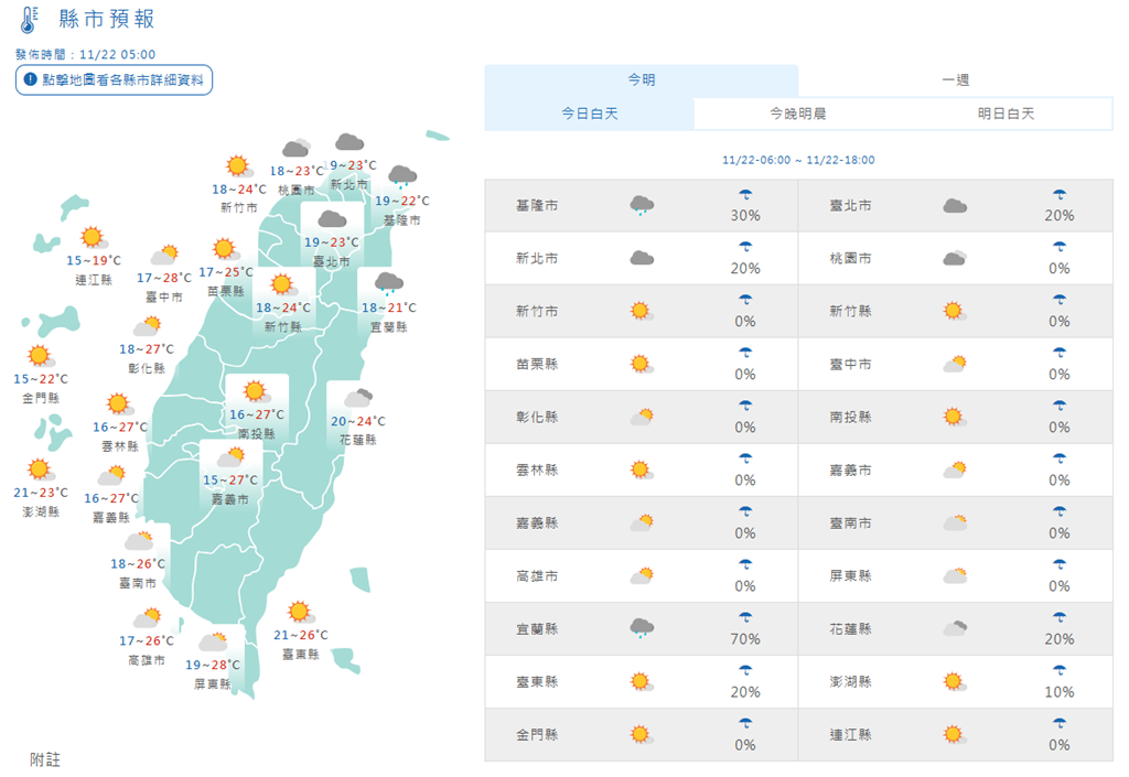 11/22全台天氣預報。圖/中央氣象署氣象專家林得恩指出,今天是「小雪」,在此節氣前後,烏魚群開始陸續游到臺灣海峽,等到「大雪」節氣時,就是烏魚子的盛產季,而「小雪」主要是反應東北季風將會越來越強,有些地方因受到地形的影響,風勢較一般來得強烈,溫度也會隨之而轉涼、轉冷。