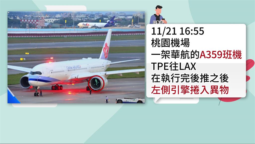 飛機左側引擎高速轉動,可裡頭卻出現一個藍綠色的物體,跟著葉片轉啊轉,目擊民眾看到這一幕覺得很驚險,表示21號下午接近5點,桃園機場看到一架華航班機執行完後推,左側引擎竟捲入一個不明異物。