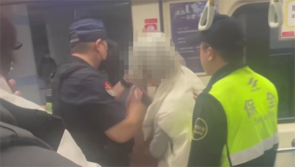 台北捷運西門站一名白髮婦人,疑似遭踩到腳引爆衝突,在車廂內持水果刀恐嚇男乘客,捷運警察獲報後將人上銬帶回,嚇壞不少目擊乘客。
