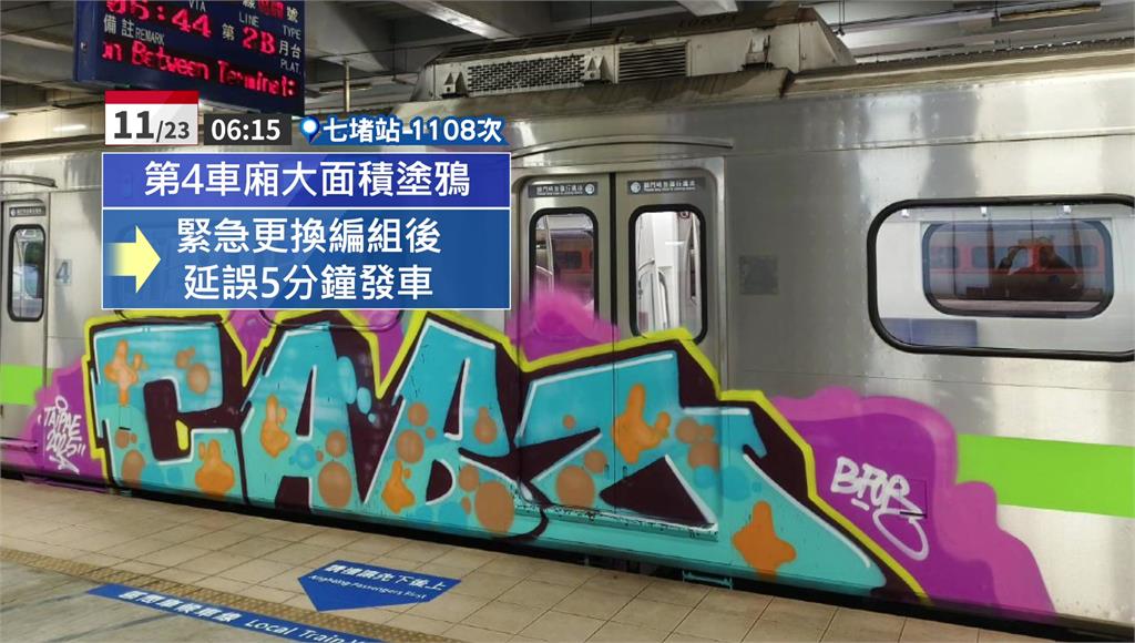 事件發生在23日七堵站1108次列車第4車廂,火車車廂外頭有一半面積被噴上彩色塗鴉,這可不是藝術設計,而是被有心人士惡意噴漆,因為臨時要清除來不及,台鐵只好緊急更換編組,因此延誤5分鐘發車。