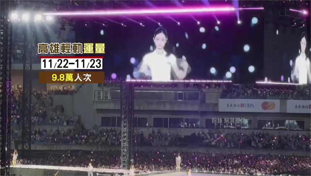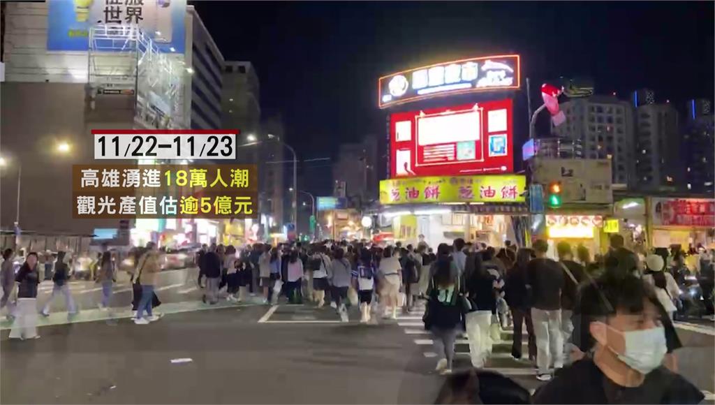 高雄週末2天湧入18萬人潮,觀光產值超過5億。圖/台視新聞高雄市長陳其邁提到,尤其是在夜市,商家甚至營業到清晨3點、4點,人潮還是非常的多。另外,高雄捷運量第一天35萬、第二天30.3萬,輕軌兩天加起來也突破9.8萬人次,可見演唱會經濟有多驚人。