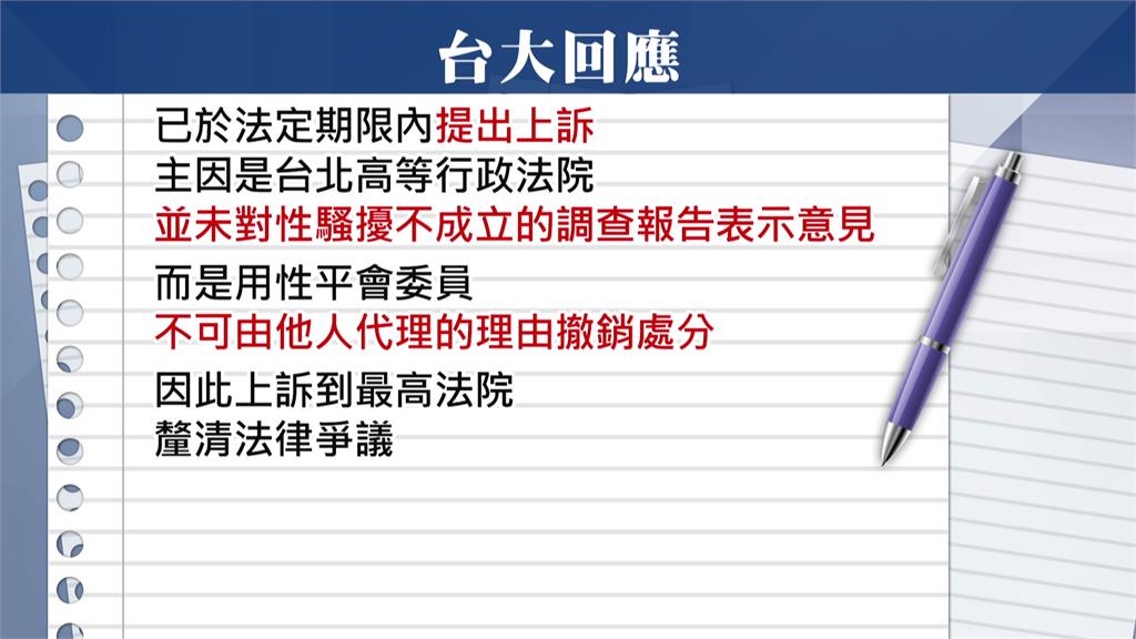 對此,台大回應,案件提出上訴是因為台北高等行政法院並未對性騷擾不成立的調查報告表示意見,而是用性平會委員不可由他人代理的理由撤銷處分,因此希望釐清法律爭議。