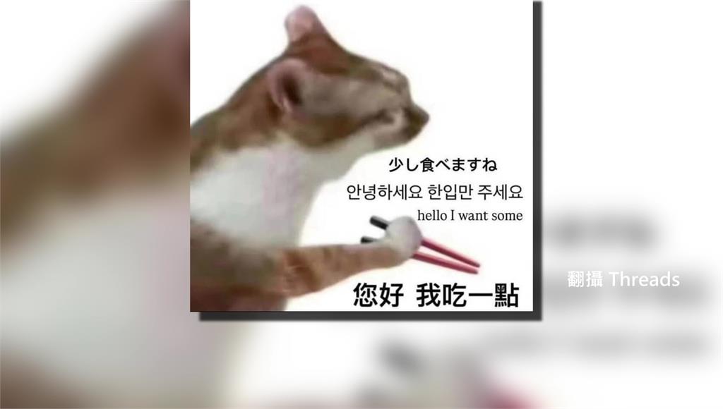 貓咪迷因在threads上相當多人使用。圖/翻攝自threads「你好,我吃一點」貓咪迷因圖,脆友一定不陌生,該圖片時常出現在日韓網友分享台灣美食的貼文底下,成了另類台式打招呼圖卡,引發好幾波貓咪大戰,現在這隻拿著筷子的貓咪,也成了最新外交大使。