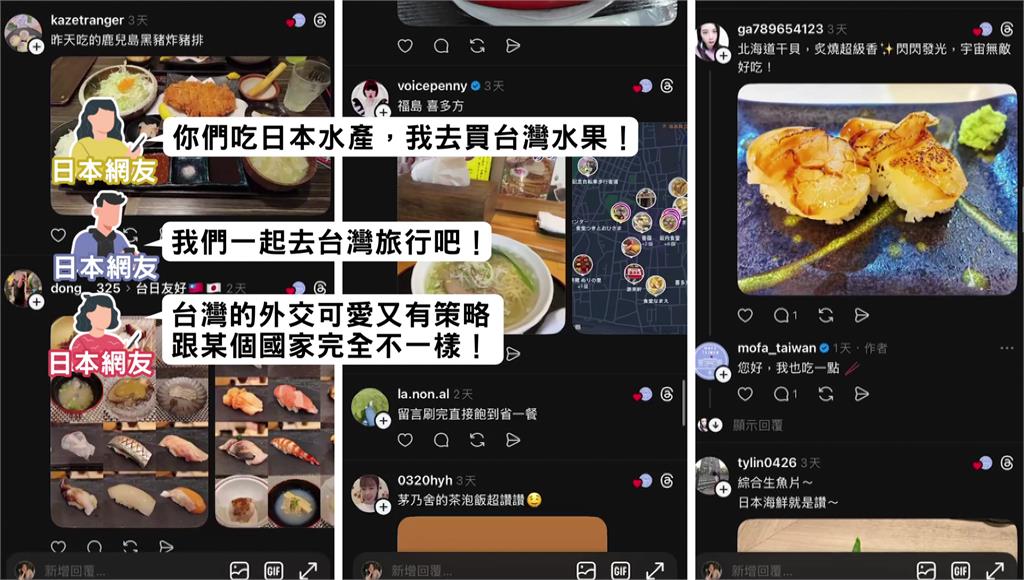 外交部以貓咪迷因圖為靈感,特別以中日文製作圖卡,「您好,我吃一點」,貼文一出,台灣網友紛紛曬出各種日本美食照響應,讓日本網友感動表示,要去買台灣水果、要去台灣旅行,還有人直呼,台灣的對日外交可愛又有策略,跟「某個國家」完全不一樣。