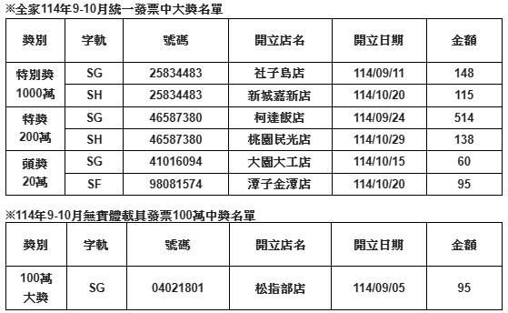 2025年9-10月統一發票獎號今(25)日出爐,全家便利商店共有6位幸運兒抱回大獎,開獎店舖橫跨台北、花蓮、桃園及台中。特別獎1000萬開出2組,獎落「全家」社子島店、花蓮新城嘉新店,其中一位幸運兒購買拿鐵與零食,共花費148元,另一位則花費115元購買義大利麵及西瓜,即中千萬大獎。